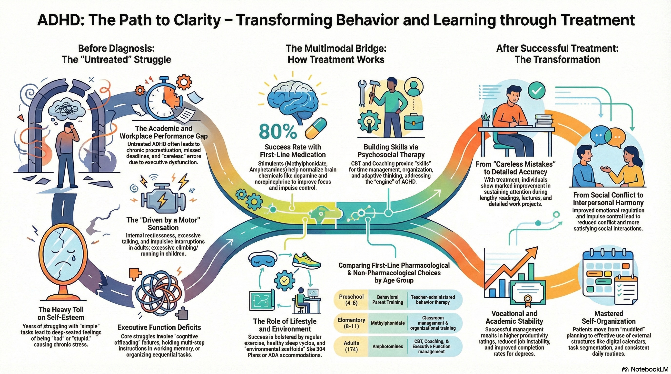 A beautiful, at-a-glance visual summary of ADHD — what it is, the three types, how it is diagnosed, and what treatment looks like. Perfect for printing out and sharing with family or teachers.