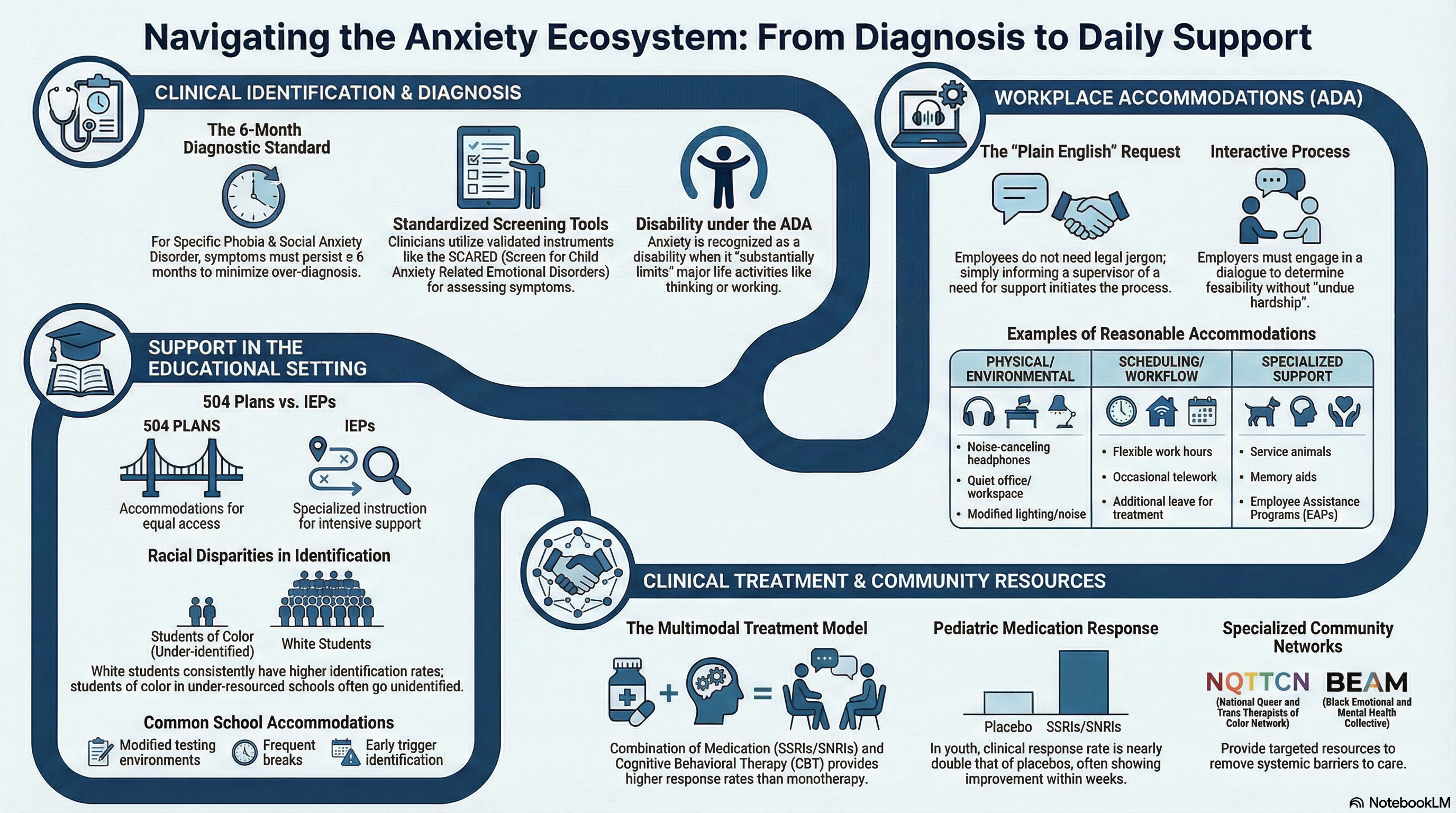A clear, visual summary of anxiety disorders — what they are, the different types, how they are diagnosed, and what treatment options are available. Perfect for sharing with family members.