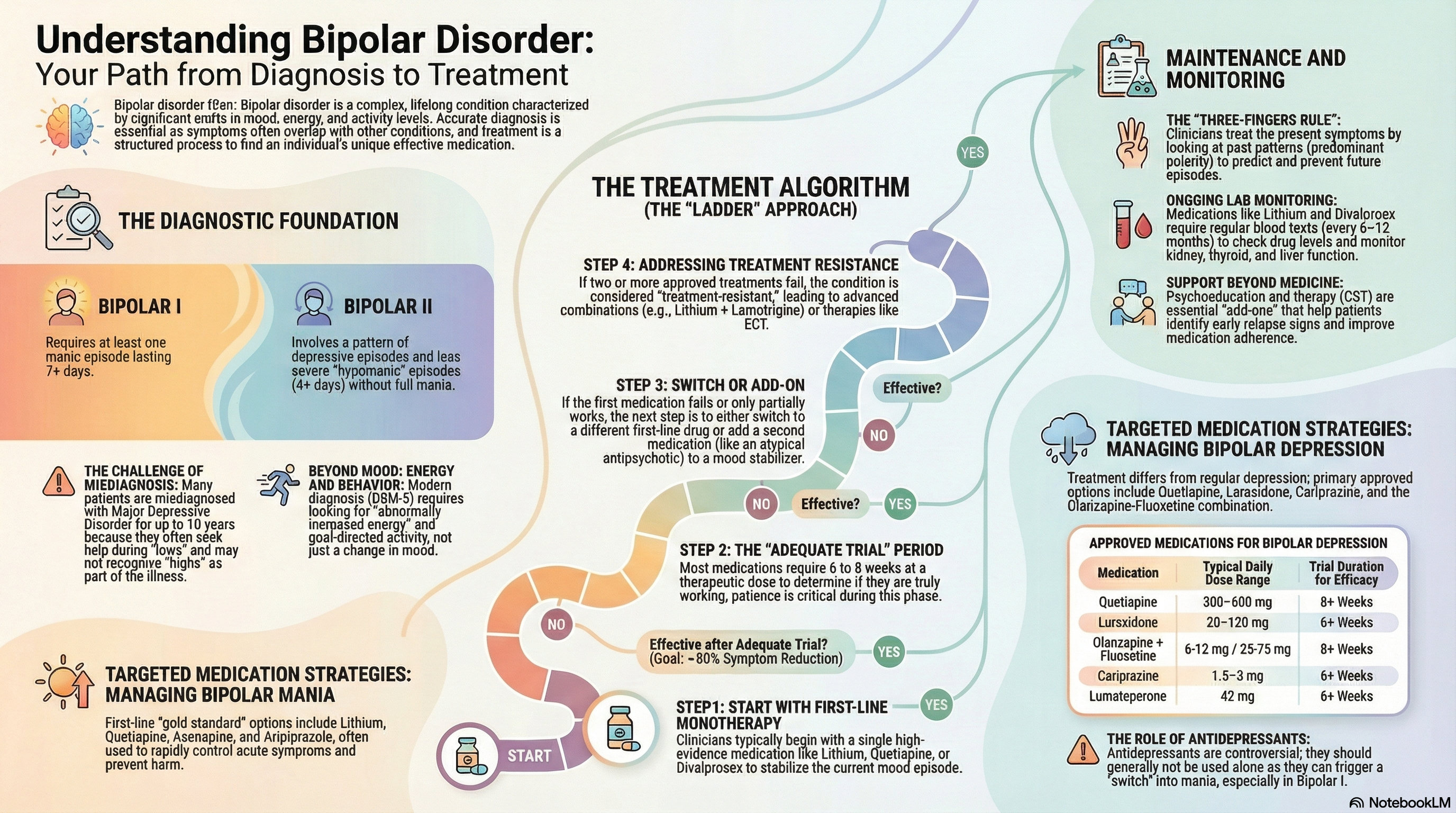 Two hosts walk through the treatment algorithms for bipolar disorder — how doctors decide which medications to try first, what works differently for adults vs. children, and what to expect along the way.