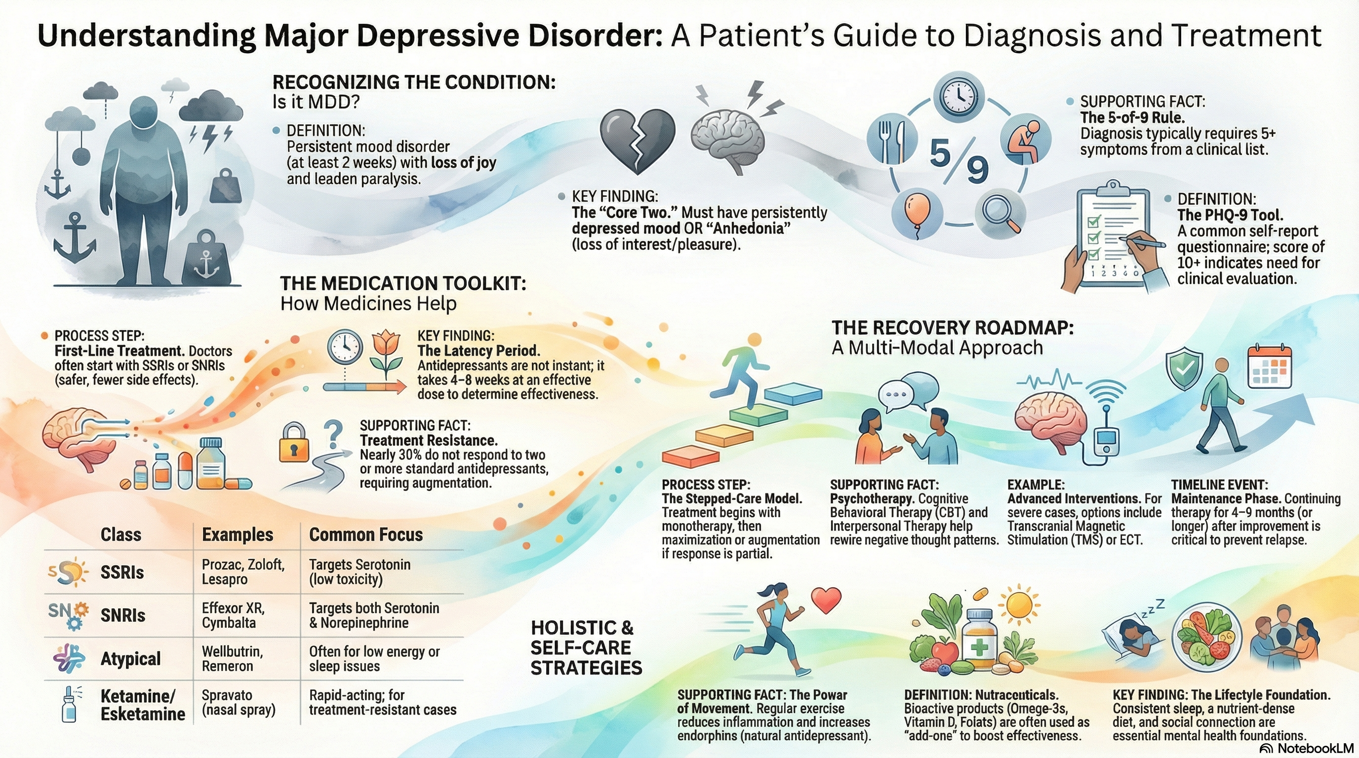 A clear visual summary of clinical depression — the signs, the science, treatment options, and why recovery is absolutely possible. Great for sharing with loved ones who want to understand.