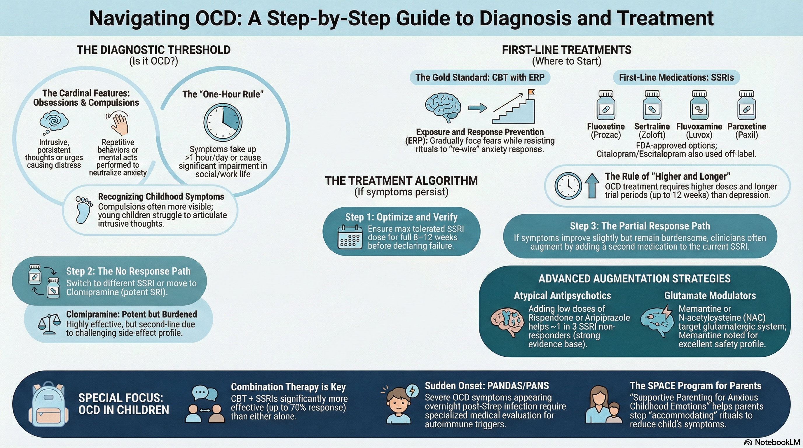 A visual summary of OCD — the obsession-compulsion cycle, common types, how it is diagnosed, and why treatment works. Perfect for understanding the condition quickly and sharing with others.