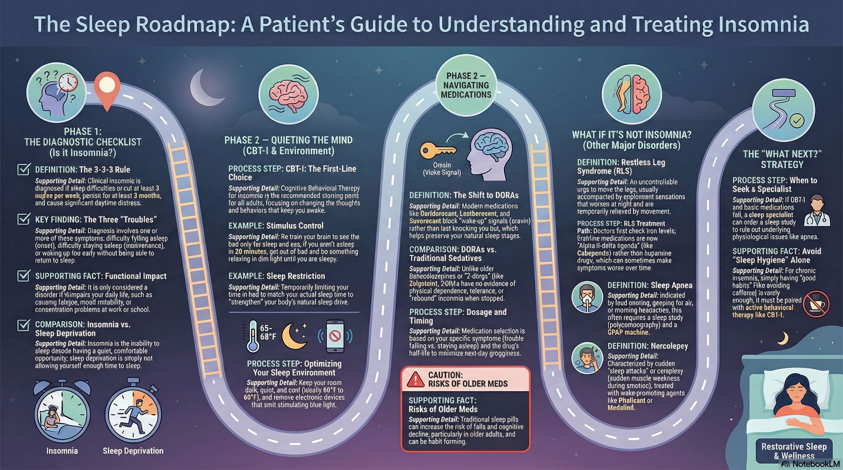 A visual guide to insomnia and sleep disorders — why sleep matters, what disrupts it, and the treatments that help you get the rest you need. Great for understanding the full picture at a glance.